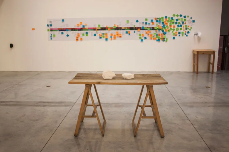 When exhibited in NYC, the visualization gave the visitors a basic context to approach the artworks and to understand the relevance of the exhibition in both a national and a global scale. But in Guatemala, the timeline served as a discussion-starter, inviting people to reflect on the information they were reading and to participate in the conversation by either inserting bites of their personal stories, suggesting additions or revisions to the already existing layers, or imagining the future of their country. Ranging from the trivial to heartfelt, the participatory installations in Xela and Guatemala City gathered the most diverse contributions, evidencing the blurred boundaries between the notions of history, collective memory, and personal memories as well as problematizing around them.